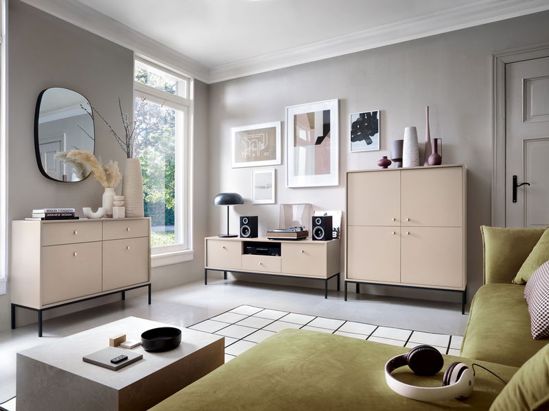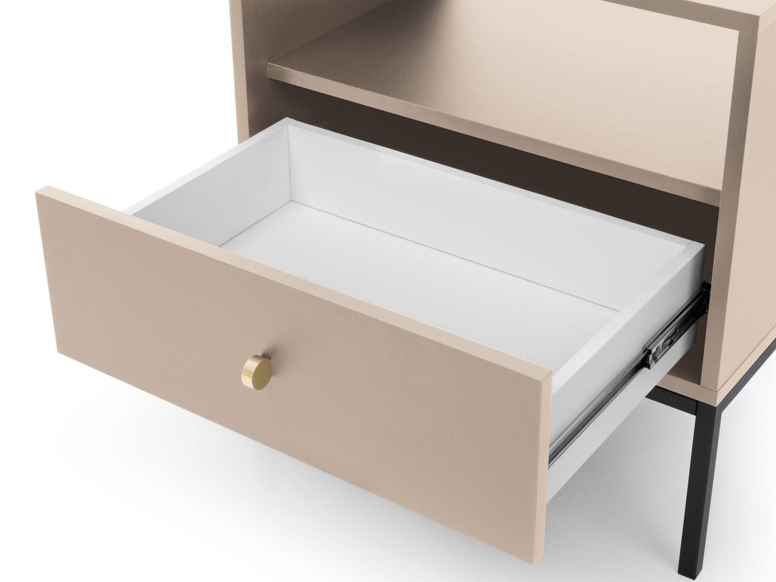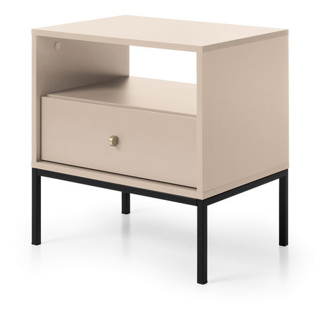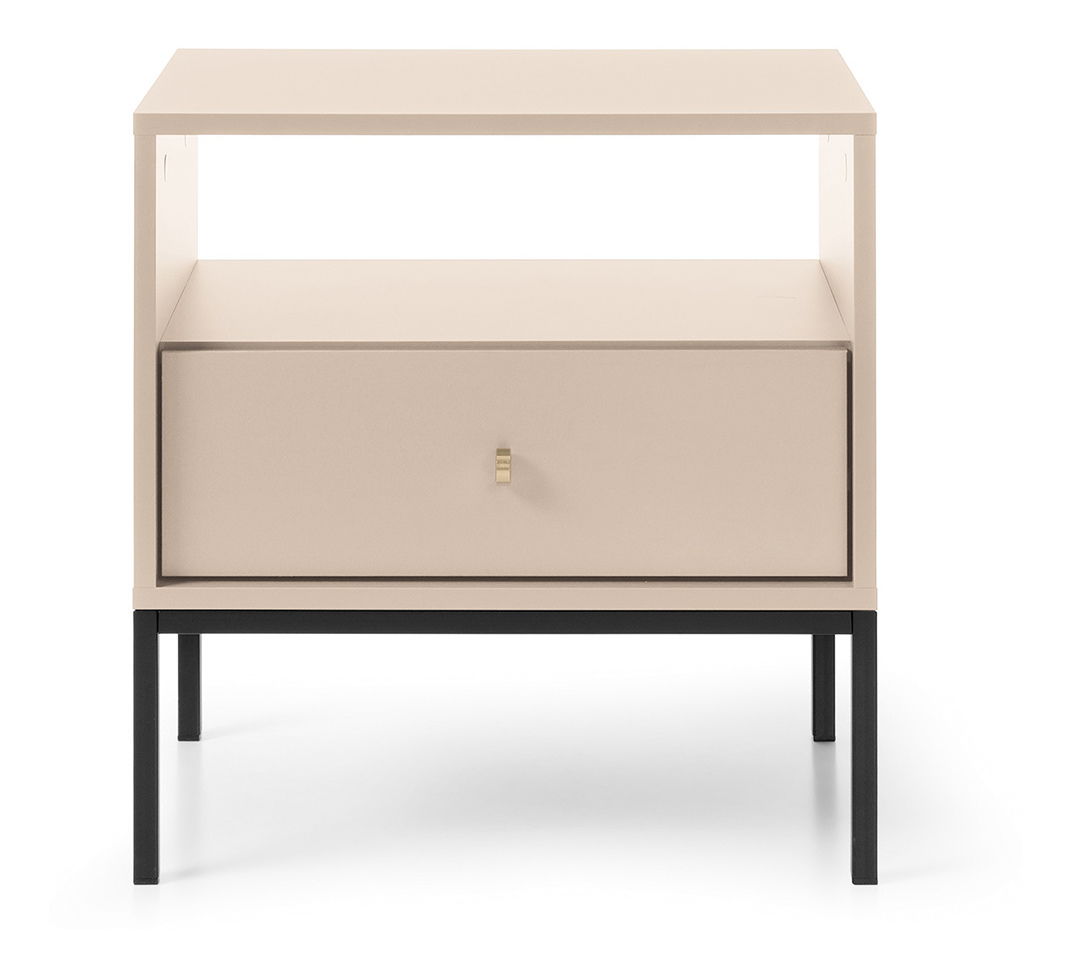 ZobrazitJednoduchý noční stolek s praktickým šuplíkem Montre si vás získá příjemnou pískovou béžovou barvou. Na vrch stolku si položte lampičku, do otevřeného prostoru si uložte křížovky nebo rozečtenou knihu a do zásuvky pouzdro od brýlí a pod. Stolek má zlaté úchyty ve tvaru knoflíků a stojí na černých kovových nožičkách. Nábytek je vyroben z 16 mm silné laminované desky ošetřené ABS hranami.