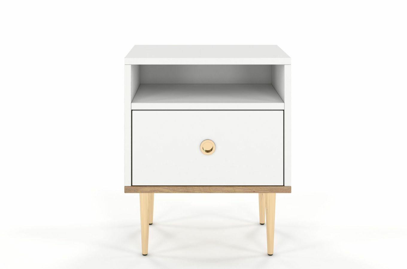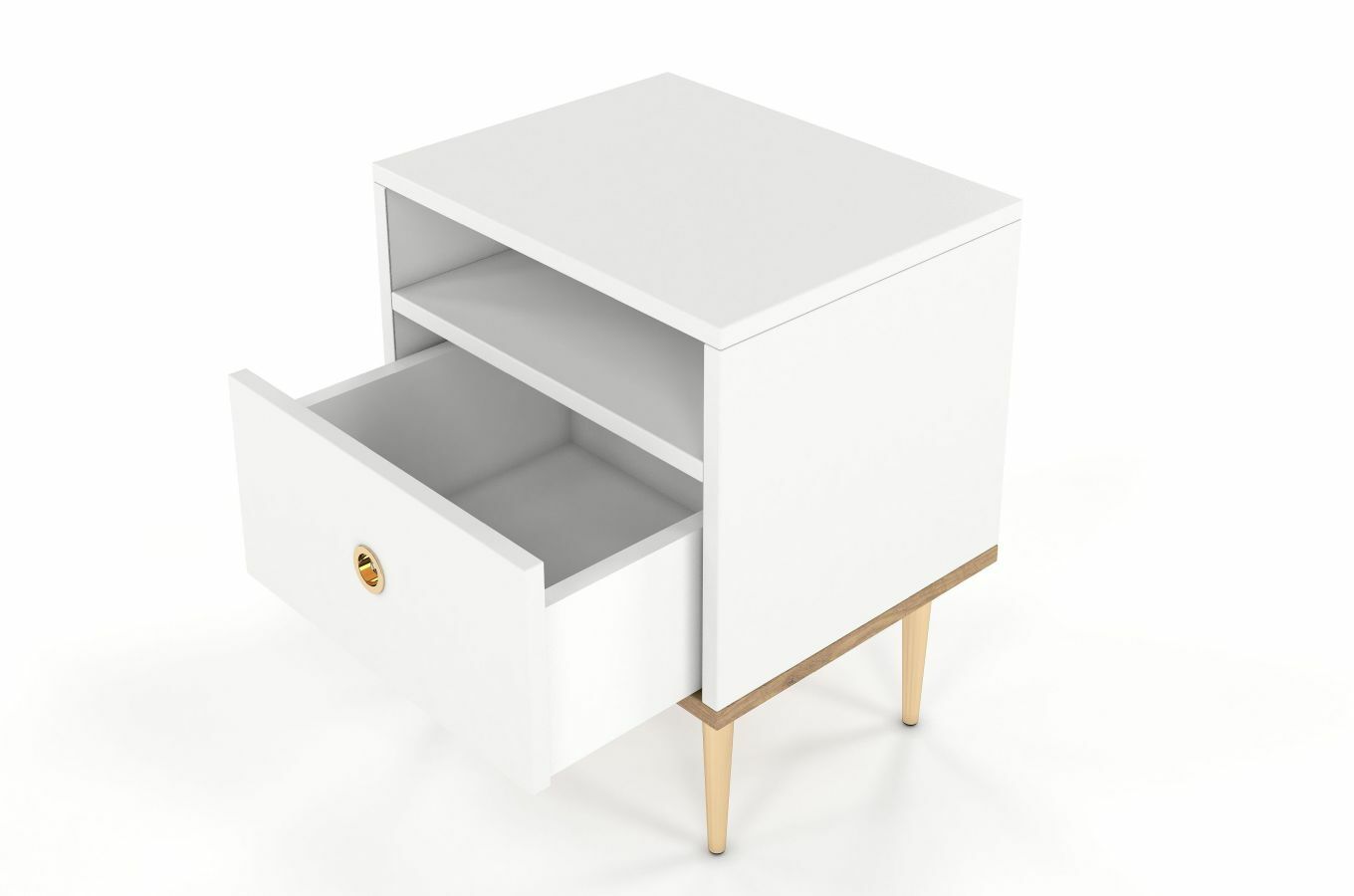 ZobrazitNoční stolek Naturlig Harmy o výšce 54,6 cm a hloubce 38 cm v bílé a dubové barvě je ideálním doplňkem do Vaší ložnice. Stolek je vybaven prostornou zásuvkou a menší poličkou, které Vám poskytnou dostatek místa pro uskladnění praktických předmětů. K otevírání zásuvky slouží funkce Push to Open. Korpus a přední části jsou vyrobeny z bělené nábytkové desky o tloušťce 18 mm, zatímco police a vnitřní stěny jsou z dubového dřeva. Nohy jsou kovové a mají zlatou barvu. Úchytky zapuštěné do desky mají průměr 40 mm a jsou také zlaté. Panty zajišťují jemné zavírání. Noční stolek Naturlig Harmy je moderním a praktickým doplňkem Vaší ložnice.