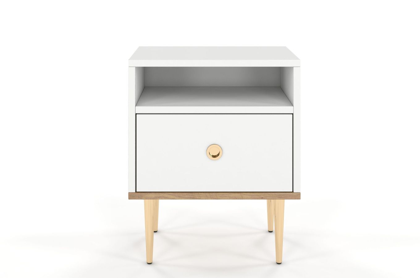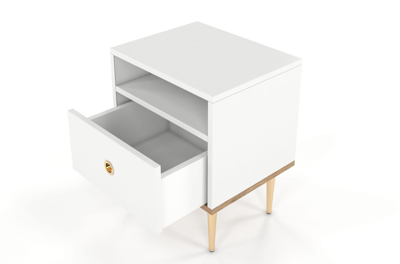Noční stolek Naturlig Harmy o výšce 54,6 cm a hloubce 38 cm v bílé a dubové barvě je ideálním doplňkem do Vaší ložnice. Stolek je vybaven prostornou zásuvkou a menší poličkou, které Vám poskytnou dostatek místa pro uskladnění praktických předmětů. K otevírání zásuvky slouží funkce Push to Open. Korpus a přední části jsou vyrobeny z bělené nábytkové desky o tloušťce 18 mm, zatímco police a vnitřní stěny jsou z dubového dřeva. Nohy jsou kovové a mají zlatou barvu. Úchytky zapuštěné do desky mají průměr 40 mm a jsou také zlaté. Panty zajišťují jemné zavírání. Noční stolek Naturlig Harmy je moderním a praktickým doplňkem Vaší ložnice.