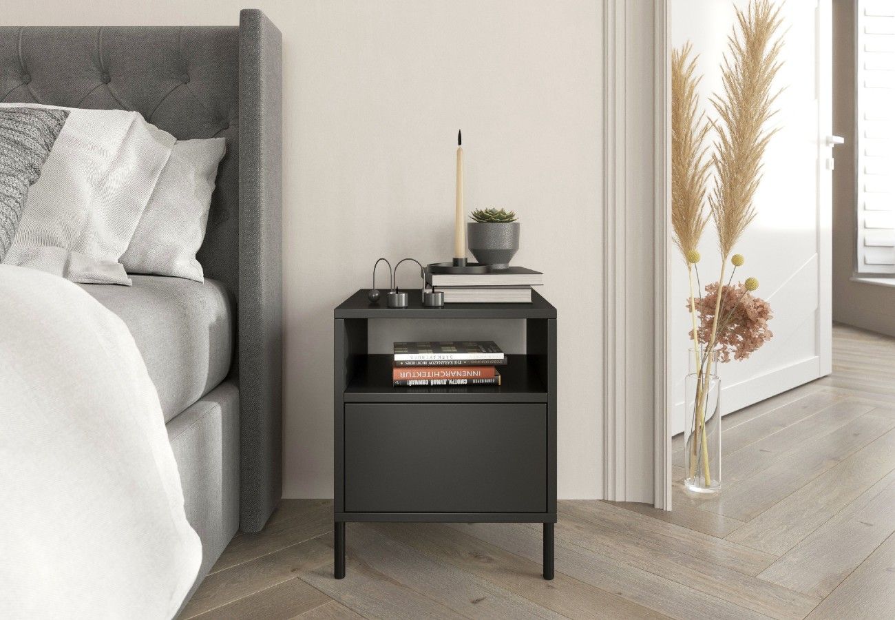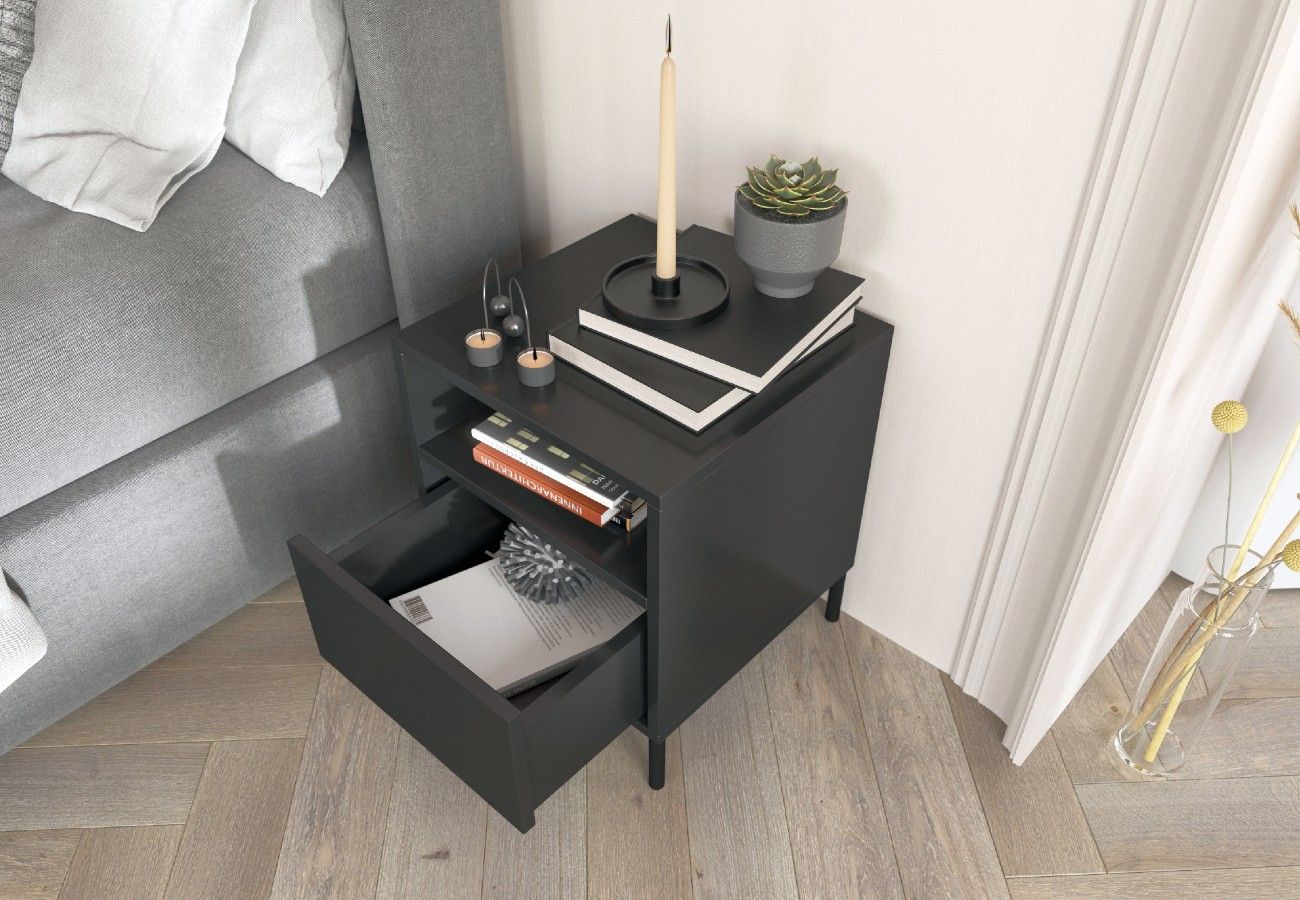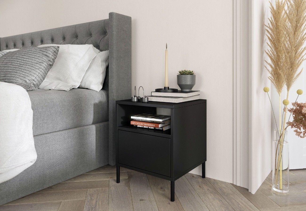 Noční stolek Naturlig Maera (černá) má výšku 57 cm a hloubku 40 cm, vyroben je z kvalitního melaminového materiálu. Stolek má stylový černý povrch a nožičky výšky 20 cm o průměru nohou 2,5 cm. Polička má šířku 36,4 cm a výšku 12,6 cm. Šířka fronty zásuvky je 36,4 cm a výška fronty zásuvky je 18,6 cm. Otevírání zásuvek/dvířek je pomocí push to open závěsů Hettich, vodící lišty jsou teleskopické. Noční stolek Naturlig Maera je praktickým a elegantním doplňkem do každé ložnice.