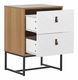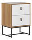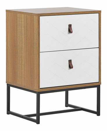 Pokud hledáte tradiční nábytek s moderním nádechem, tento noční stolek je skvělou volbou. Je vyroben z odolné desky MDF v kombinaci světlého dřeva a bílé barvy a stojí na stabilním černém kovovém podstavci. Stolek má 2 zásuvky, které poskytují prostor pro uložení drobných předmětů. Perfektně zpracované detaily, jako jsou úchyty z umělé kůže a matné čelo s jemným vzorem rybí kosti, jsou poutavé a dodávají skříni jedinečný vzhled.