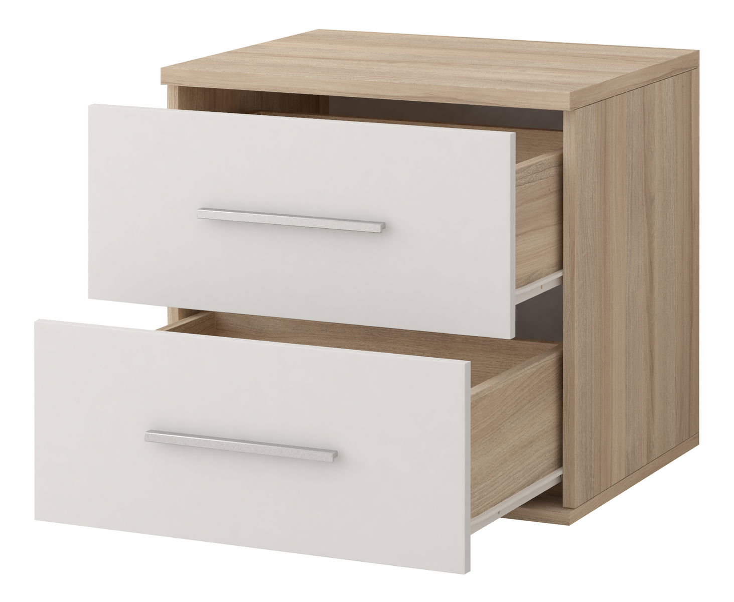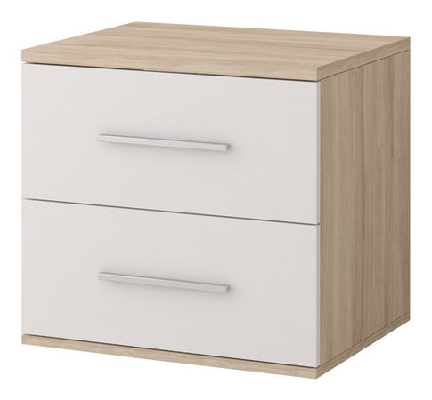 Noční stolek Oleg má moderní a minimalistický design. Je vyroben z dřevotřísky o tloušťce 16 mm a má ABS hrany o tloušťce 0,5 mm. Jeho úchyty jsou stříbrné a vyrobeny z plastu. Stolek nemá nožičky a má 2 šuplíky, což poskytuje praktický úložný prostor u postele. Je to ideální doplněk do vašeho interiéru, který kombinuje jednoduchost a funkčnost.