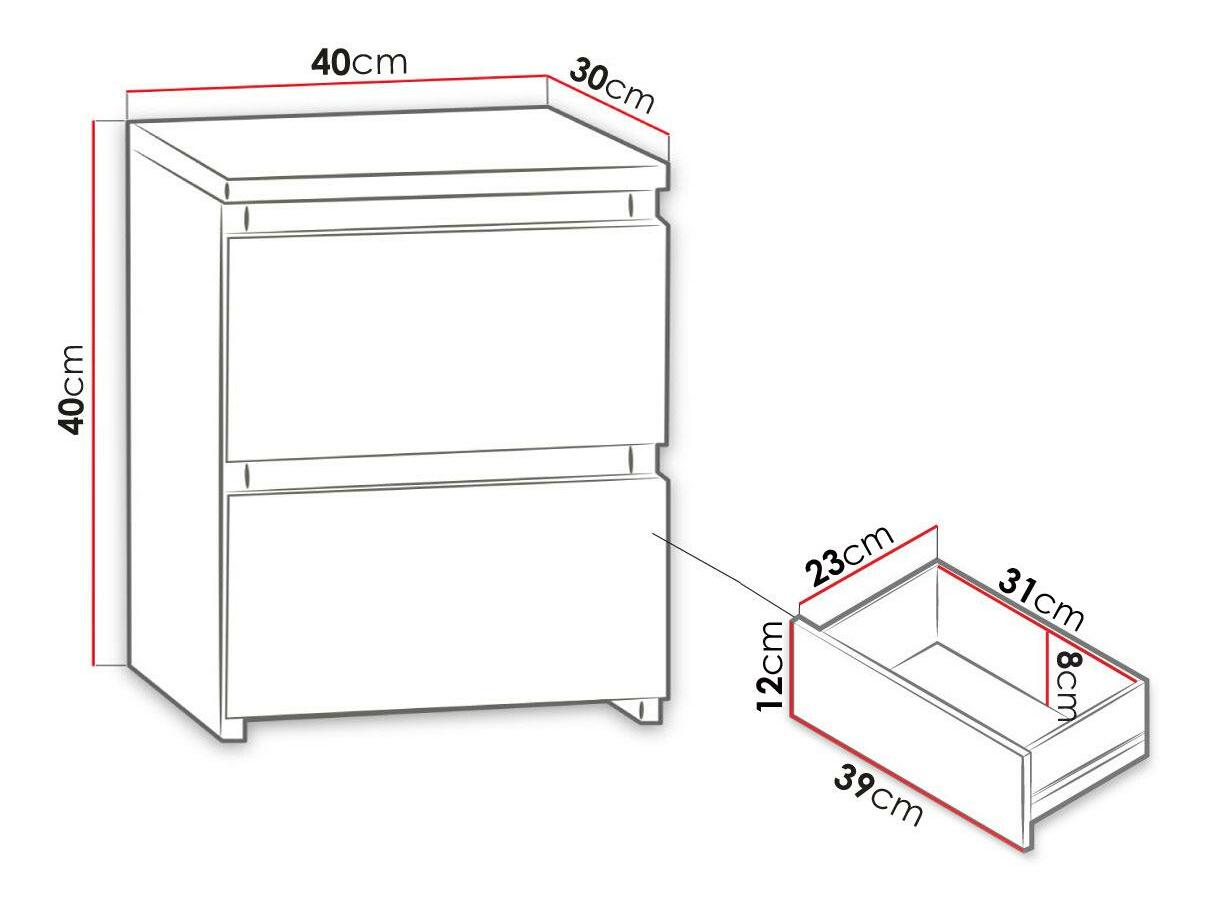 Jednoduchý, funkční as jedinečným designem. Co víc si můžete od nočního stolku Orion OK2 přát? Tento model se vyznačuje módními a sytými barvami, které jistě sladíte se zařízením své ložnice. Noční stolek poskytuje nejen dostatek prostoru pro uložení praktických doplňků potřebných před spaním, ale slouží také jako ideální místo pro noční lampu nebo budík. Je vybaven dvěma prostornými zásuvkami. Noční stolek má kompaktní rozměry, aby se vešel i do malé místnosti. Je vyroben z pevné laminované dřevotřísky s PVC lemováním, které zvyšuje jeho odolnost.