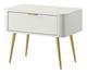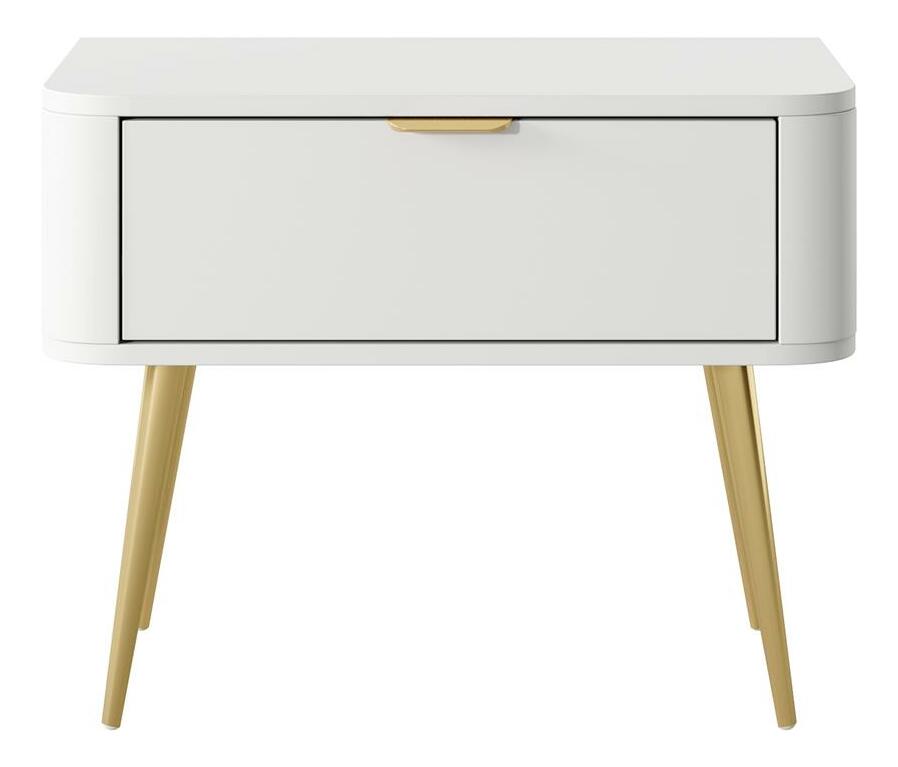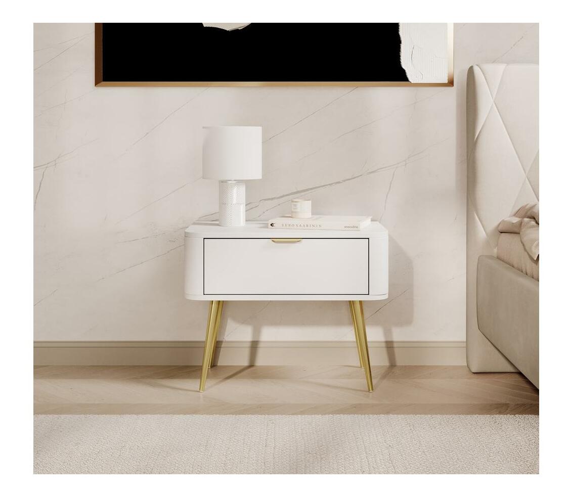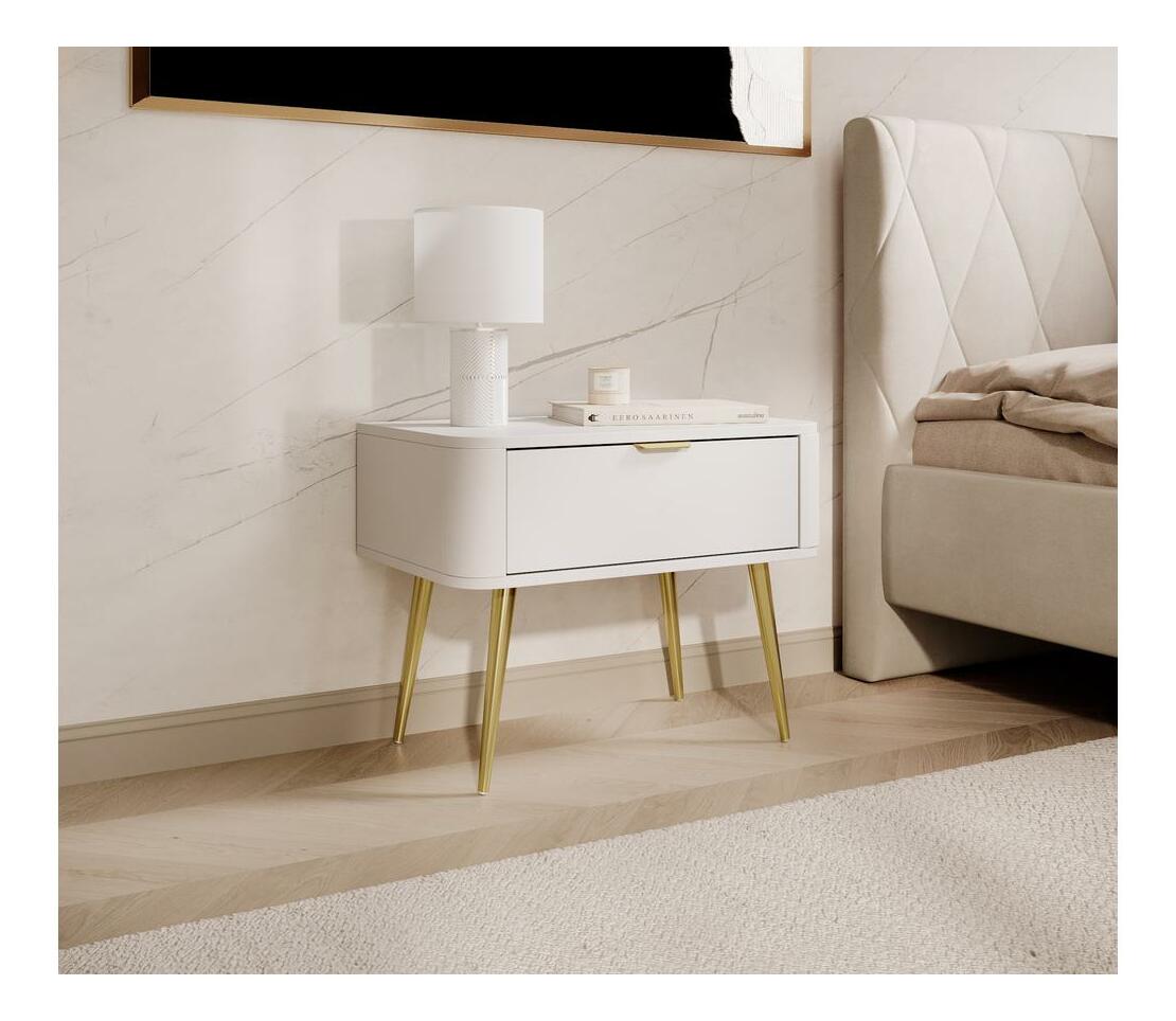 Nudí vás klasické tvary nábytku? Chcete změnit svůj byt? Vyberte si kolekci a překvapte všechny své hosty Noční stolek je moderním kusem nábytku, který překvapí svým tvarem, dodávají eleganci a jsou vhodné pro děti. Skříňka má jednu zásuvku, do které se vejde vše potřebné vedle postele. Další výhodou je stolová deska, na kterou můžete umístit elegantní lampu nebo položit telefon. Moderní tvar dodává interiéru lehkost a činí jej útulnějším Detaily produktu: korpus a čela z laminované nábytkové desky Kronospan 6459 SM v barvě Platinum White, konstrukce vyztužená ABS hranami, které mu dodávají stabilitu a odolnost, vysoké ocelové nohy povrch upravené chromem. zlaté, mají malé bílé nožičky, které zabraňují poškrábání podlahy, zásuvky umístěné na 27 mm kuličkových vodítkách, jemné zlaté, broušené úchyty dodávají funkčnost a jsou stylu ozdobou čel.