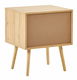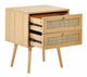 Tento noční stolek je moderním prostorově úsporným doplňkem do ložnice. Je vybaven dvěma zásuvkami a nabízí úložný prostor pro příslušenství i místo pro noční lampu v horní části. Jeho světlý dřevěný odstín má univerzální barvu, zatímco ratanová přední strana nabízí nádech boho stylu. Korpus je vyroben z dřevotřísky a MDF, zatímco nohy jsou vyrobeny z borového dřeva.