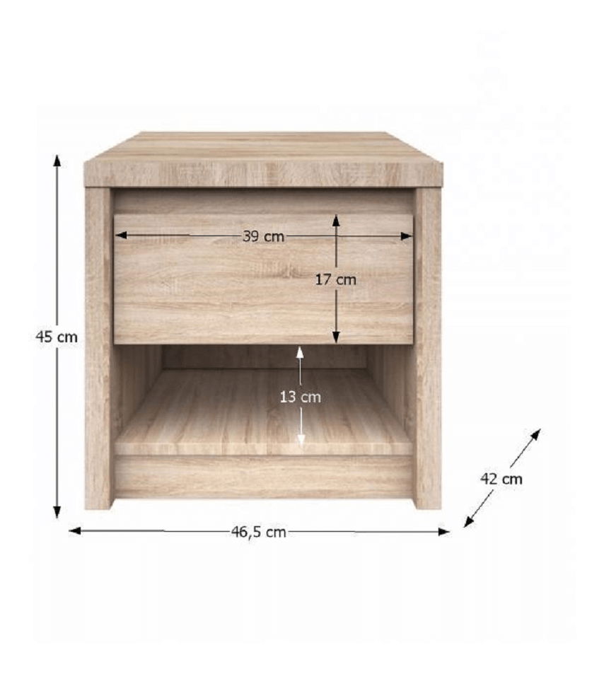 Noční stolek Rihana Typ 13 o výšce 45 cm a hloubce 42 cm je ideálním doplňkem pro vaši ložnici. Vyroben z kvalitní DTD laminované desky, tento stolek je odolný a dlouhotrvající. Provedení v dub sonoma barvě vám umožní snadno jej sladit s vaším nábytkem. Rozměry 46,5x42x46 cm poskytují dostatek prostoru pro vaše knihy, hodinky a jiné osobní věci. Stolek má tloušťku materiálu 32 mm a pro zbývající části 16 mm, což zaručuje jeho stabilitu a pevnost. Dodáván v demontu, což umožní snadné přenášení a jednoduchou montáž. Noční stolek Rihana Typ 13 bude skvělým doplňkem vaší ložnice a poskytne vám praktické a funkční řešení pro vaše osobní věci.