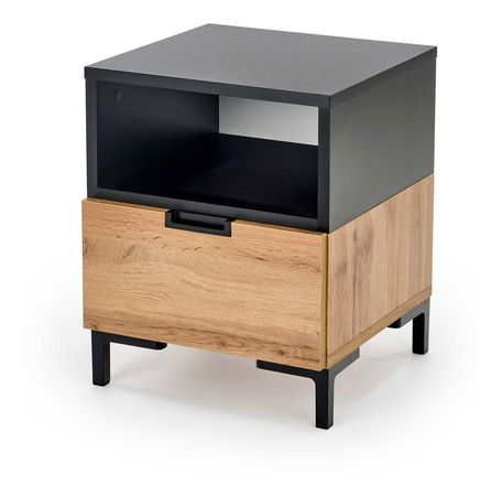 Noční stolek Shakita v dub wotan barvě s černými detaily je ideálním doplňkem do každé ložnice. S výškou 52 cm a hloubkou 40 cm nabízí dostatek místa pro osobní věci jako knihy, hodinky nebo mobilní telefon. Je vyroben z kvalitního materiálu, který zajišťuje dlouhou životnost a odolnost. Jednoduchý, ale elegantní design s kombinací dřeva a černé barvy dodává interiéru vkusný a moderně sladěný vzhled. Noční stolek Shakita je skvělou volbou pro ty, kteří hledají praktický a krásný stolek pro svoji ložnici.