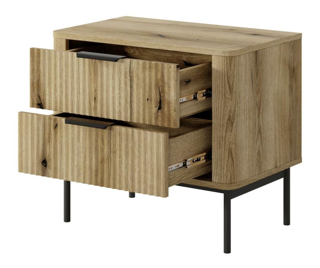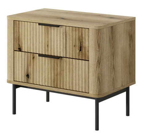 Nočný stolík Wilsire (dub coast evoke) je elegantným a funkčným doplnkom do vašej spálne. Vyrobený z laminovanej drevotriesky a temperovaného skla, s MDF hrúbkou 16 mm po stranách a 18 mm na prednej časti, zaručuje pevnosť a odolnosť. Stolík disponuje 2 zásuvkami, ktoré poskytujú dostatok úložného priestoru. Čierne kovové úchytky a nožičky dodávajú moderný vzhľad a stabilitu. Tento nočný stolík kombinuje estetiku a praktickosť, ideálny pre každodenné použitie.