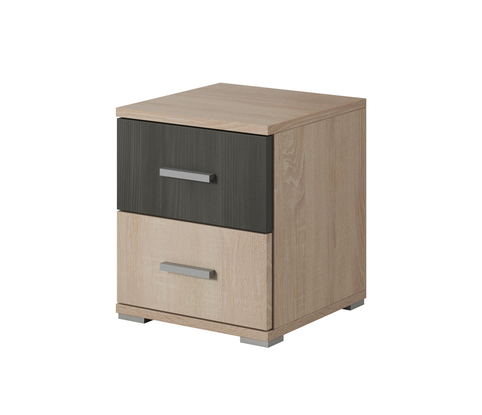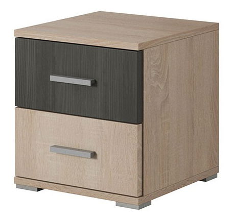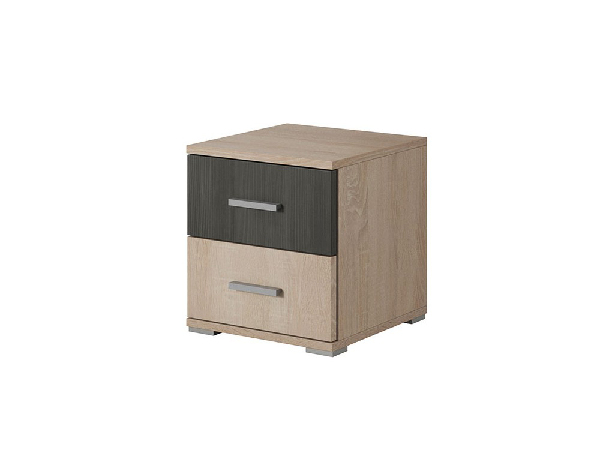 Noční stolek Wisteria výška 44,5 cm hloubka 40 cm Dub sonoma + Borovice černá norská. Tento stolek je vyroben z kvalitní dřevotřísky s ABS hranami o tloušťce 0,5 mm a 1,7 mm. Vnější materiál je z 16 mm dřevotřísky a vnitřní materiál z 32 mm dřevotřísky. Stolek je vybaven plastovými úchyty a je ideálním doplňkem do každé ložnice. Jeho moderní design a přírodní barvy dokonale zapadnou do jakéhokoli interiéru. Využijte tento praktický stolek pro uložení knih, telefonu nebo lampy a užijte si jeho funkčnost a nádherný vzhled.