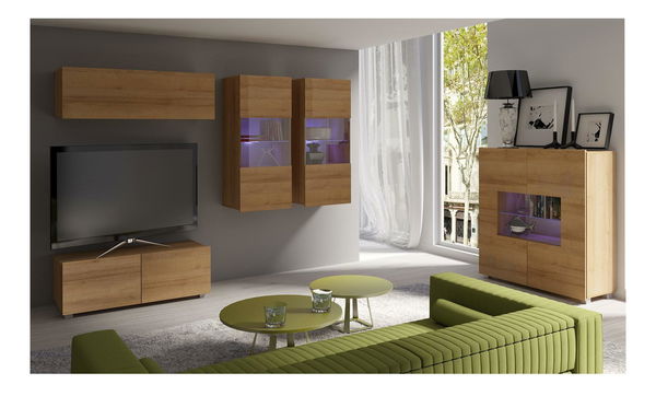 Teplé tóny dubu zlatého v obývacím pokoji Calabria 3 vytvářejí příjemnou a harmonickou atmosféru, která vás okamžitě vtáhne do pohodlí domova. Vitrína, závěsné vitríny, police i TV stolek spolu ladí do jednotného, vkusného celku, který působí útulně, ale zároveň moderně. Jemná kresba dřeva zvýrazňuje přírodní charakter nábytku a přináší do interiéru nádech elegance a klidu. Tato sestava je jako stvořená k vytvoření obývacího pokoje, kde se budete cítit opravdu doma.