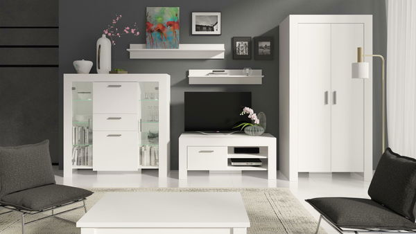 Obývací pokoj Camber 4 v čistě bílém provedení působí nadčasově, vzdušně a elegantně – ideální řešení pro interiér, který touží po světle a vizuálním klidu. Šatní skříň vnáší do prostoru praktický pořádek, vitrína dodává nádech jemné výstavnosti a TV stolek s konferenčním stolkem vytvářejí vyvážený střed obývacího pokoje, kde se potýká každodenní život. Polička dotváří sestavu jako místo pro knihy, dekorace či vzpomínky, které dávají prostoru duši. Camber 4 je jako plátno, na kterém si můžete namalovat svůj domov - čistý, harmonický a vždy aktuální.