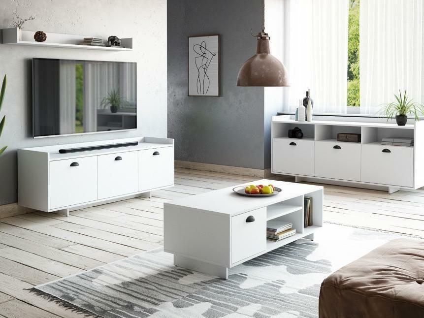 Obývací pokoj Caspono 1 v čistě bílém provedení působí moderně, vzdušně a minimalisticky. TV stolek Caspono poskytuje dostatek místa pro techniku, skříňka nabízí praktický úložný prostor s otevřenými i uzavřenými částmi. Konferenční stolek doplňuje sestavu svojí jednoduchostí a funkčností. Ideální řešení pro ty, kdo hledají čistý, světlý a nadčasový interiér.