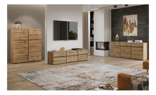 Teplý odstín dubu Wotan vnáší do obývacího pokoje přirozenou harmonii a vizuální pohodu, zatímco čisté linie a hladké povrchy působí moderně a nadčasově. Sestava nabízí praktická úložná řešení v podobě uzavřených skříněk a zásuvek, které zajišťují pořádek a přehlednost. Kvalitní materiály a precizní zpracování zaručují dlouhou životnost a snadnou údržbu. Tato sestava je ideální volbou pro ty, kteří hledají spojení funkčnosti a estetického vzhledu ve svém obývacím pokoji.