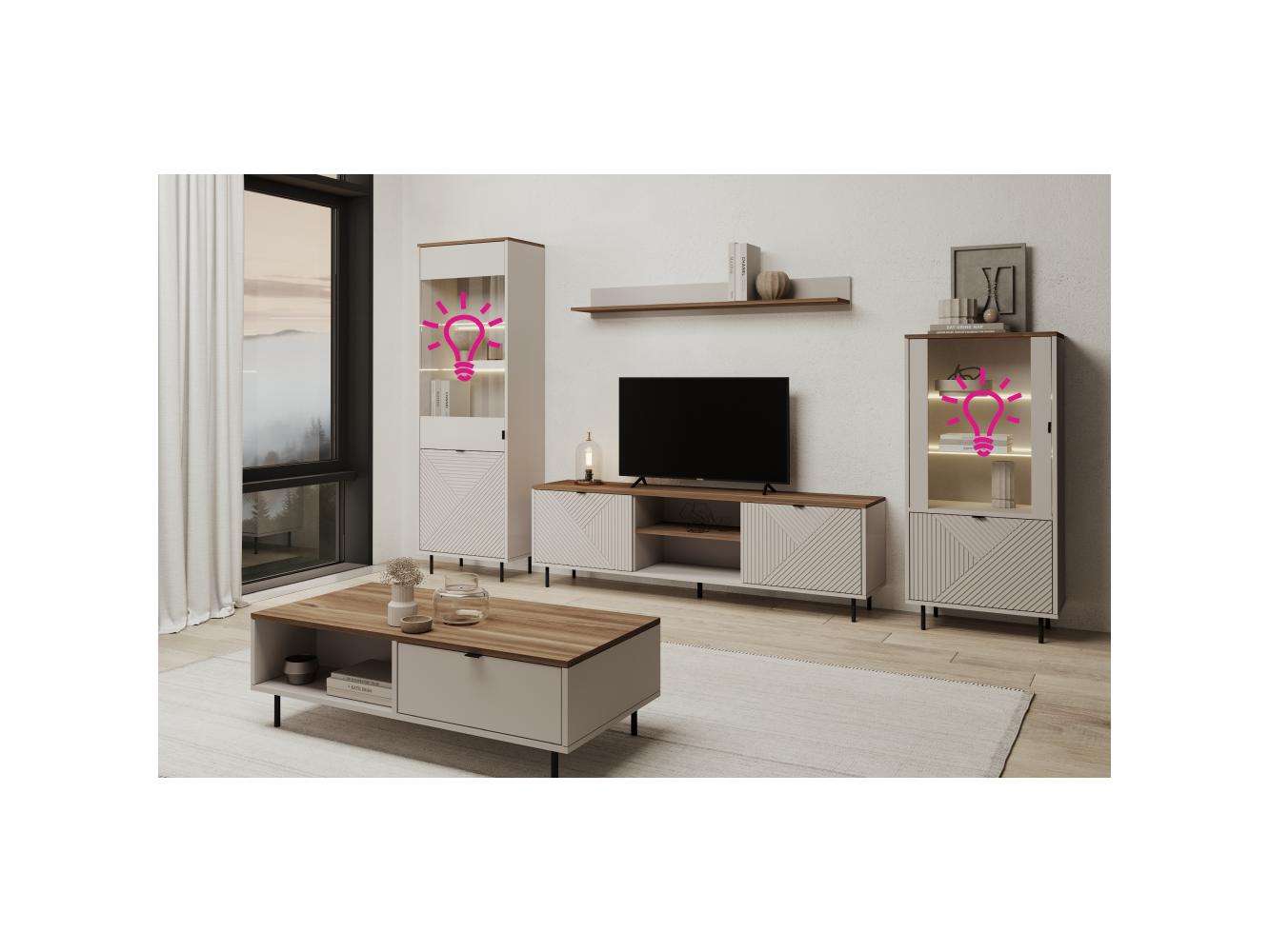 Obývací pokoj Explicaba 1 v elegantní kombinaci kašmíru a dub castello vnese do vašeho prostoru moderní styl s přírodním šarmem. Konferenční stolek nabízí praktické řešení pro každodenní používání, TV skříňka stylově ukryje elektroniku. Dvě vitríny poskytnou dostatek prostoru pro vystavení dekorací či knih, přičemž závěsná police harmonicky dotváří design místnosti. Tato sestava spojuje estetiku s funkčností pro dokonalý odpočinek.