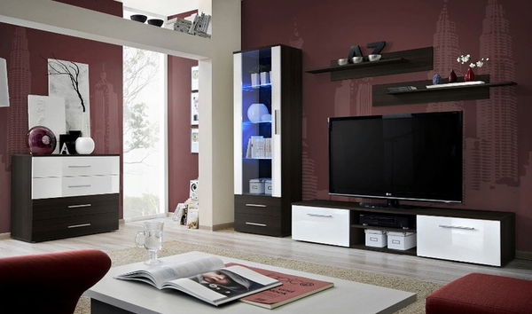 Obývací pokoj Galina B je složena z pěti prvků a je vhodná do menších prostorů. Svým designem a jednoduchostí však skvěle zapadne do interiéru obývacího pokoje. TV skříňka má dvoje dvířka, na kterých jsou elegantní, 25 cm dlouhé úchyty. Ve střední části je otevřený prostor pro uložení audio/video příslušenství. Vysoká vitrína má zčásti prosklené dveře a v dolní části dvě zásuvky. Obsahuje tři skleněné, LED osvětlením podsvícené poličky. Samostatné poličky na stěnu nabízejí další odkládací prostor na maličkosti. Prosklené části jsou vyrobeny z čirého tvrzeného skla. Nízká komoda obsahuje čtyři praktické zásuvky.