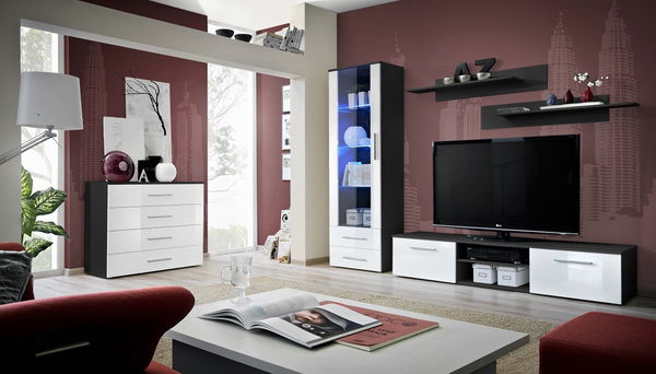 Obývací pokoj Galino B je složena z pěti prvků a je vhodná do menších prostorů. Svým designem a jednoduchostí však skvěle zapadne do interiéru obývacího pokoje. TV skříňka má dvoje dvířka, na kterých jsou elegantní, 25 cm dlouhé úchyty. Ve střední části je otevřený prostor pro uložení audio/video příslušenství. Vysoká vitrína má zčásti prosklené dveře a v dolní části dvě zásuvky. Obsahuje tři skleněné, LED osvětlením podsvícené poličky. Samostatné poličky na stěnu nabízejí další odkládací prostor na maličkosti. Prosklené části jsou vyrobeny z čirého tvrzeného skla. Nízká komoda obsahuje čtyři praktické zásuvky. Všechny fronty jsou v lesku.