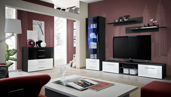 Obývací pokoj Galino B je složena z pěti prvků a je vhodná do menších prostorů. Svým designem a jednoduchostí však skvěle zapadne do interiéru obývacího pokoje. TV skříňka má dvoje dvířka, na kterých jsou elegantní, 25 cm dlouhé úchyty. Ve střední části je otevřený prostor pro uložení audio/video příslušenství. Vysoká vitrína má zčásti prosklené dveře a v dolní části dvě zásuvky. Obsahuje tři skleněné, LED osvětlením podsvícené poličky. Samostatné poličky na stěnu nabízejí další odkládací prostor na maličkosti. Prosklené části jsou vyrobeny z čirého tvrzeného skla. Nízká komoda obsahuje čtyři praktické zásuvky. Všechny fronty jsou v lesku.