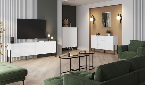 Obývací pokoj Kjukon v vás okouzlí svou harmonií a praktičností. elegantním provedení bílá matná přináší do prostoru čistotu a moderní vzhled. Set obsahuje Komodu Kjukon 200, která poskytuje široký úložný prostor ideální pro dokumenty, dekorace nebo jiné předměty; Skříňku Kjukon 110, která svými kompaktními rozměry nabízí všestranné využití; a Komodu Kjukon 150, která kombinuje funkčnost s estetickým designem. Matná bílá povrchová úprava opticky zvětšuje prostor a zajišťuje harmonický a stylový vzhled pro váš obývací pokoj. Tento nábytkový set je ideální volbou pro moderní interiér, který klade důraz na jednoduchost a praktičnost, ale vytváří místo plné pohody a vkusu.