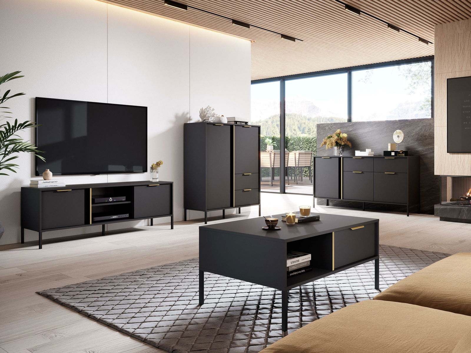Zlato a antracit – kombinace, která v sobě nese noblesu i moderní charakter. Obývací pokoj Lyran 1 působí výjimečně elegantně a zároveň příjemně díky propracovaným detailům a kontrastu tmavých ploch se zlatými akcenty. Dvě komody s různou kapacitou nabízejí flexibilní úložný prostor, zatímco TV stolek a konferenční stolek vytváří vizuálně vyvážené centrum celé místnosti. Tato sestava není jen o praktičnosti – je to nábytek s výrazem, který dodá vašemu domovu sebejistý styl a působivou atmosféru.