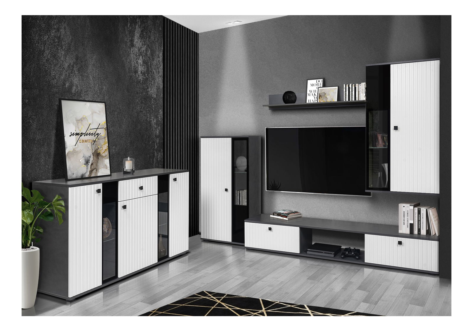Obývací pokoj Saul je víc než jen nábytek – je to atmosféra. Je to moderní a elegantní sada nábytku, která se skládá z 5 prvků - 2 vitrín, TV stolku, závěsné police a komody. Je vyrobena z laminované desky nejvyšší kvality, která chrání před vlhkostí a poškrábáním. Materiál fronty tvoří MDF desky o tloušťce 16mm a korpus se skládá z laminované desky o tloušťce 15mm a zadní strany HDF černé barvy o tloušťce 2,5mm. Nožičky jsou kulaté, černé a mají výšku 2cm. Úchytky jsou modelu GM 315 P-2 a černé, sklo je tvrzené, broušené a lakované na černo o tloušťce 4mm. Police jsou průhledné a broušené o tloušťce 5mm. Systém otevírání zásuvek je na kuličkovém vedení o tloušťce 27mm. Tichý dojezd není zahrnut. Rozměry jednotlivých částí jsou: vitrína č.1 (š.vh) 59,3x115x30,6 cm, vitrína č.2 (š.vh) 59,3x113x30,6 cm, komoda (š.vh) 140,4x80x40,2 cm, TV stolek (š. cm, závěsná police (š.vh) 102x16x17,5 cm. Tento nábytek je dostupný ve více barevných provedeních a je zapotřebíVyhotovená vlastní montáž, která zanechá dojem a pocit výjimečnosti.