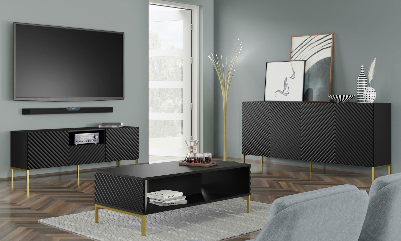 Tmavá elegance, která vás okouzlí hned na první pohled. Obývací pokoj Surfy 4 v černém provedení přináší moderní a sebevědomý design pro ty, kteří touží po interiéru s výrazným charakterem. TV stolek/skříňka Surfy 3D, konferenční stolek Surfy 3D a skříňka Surfy 4D dohromady vytvářejí harmonický celek, který působí stylově a zároveň prakticky. Černá barva dodává místnosti hloubku a dramatičnost, zatímco jednoduché linie a kvalitní zpracování zajišťují dlouhodobou spokojenost. Tento set je ideální pro každého, kdo má rád výrazný design a pořádek bez kompromisů.