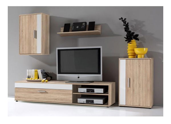 Zkrášlete si obývák touto moderní obývací stěnou v provedení dub sonoma s bílými prvky. Široký TV stolek poskytne dostatek prostoru pro váš televizor a AV zařízení. Prostorné skříňky uschovají všechny vaše CD, knihy a jiné drobnosti. Obývacia stěna je v provedení dub sonoma a bílá.