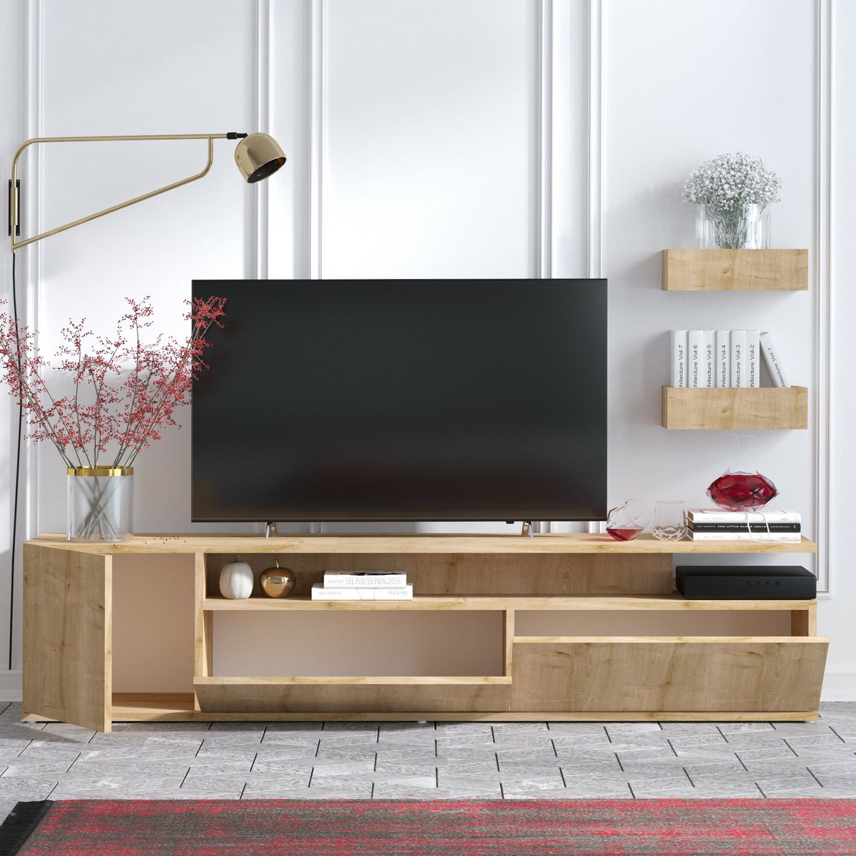 ZobrazitTV stolek/skříňka Alikate je moderní a praktická volba pro Váš obývací prostor. S výškou 45 cm, šířkou 180 cm a hloubkou 35 cm, poskytuje dostatek místa pro umístění vašeho televizoru a jiných zařízení. Vyrobeno ze 100% melaminové desky, tato skříňka je odolná a snadno se udržuje v čistotě. Díky své délce nabízí také dostatek úložného prostoru pro Vaše DVD, ovladače a jiné potřebné věci. S elegantním designem v dubovém provedení bude tato skříňka dokonalým doplňkem do vašeho interiéru.