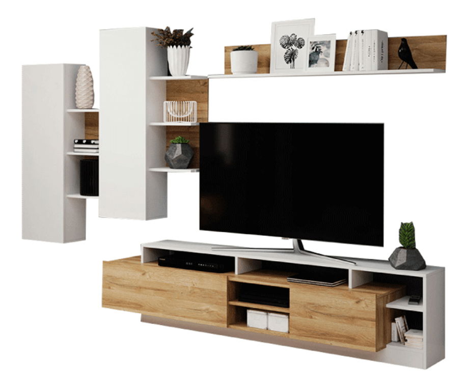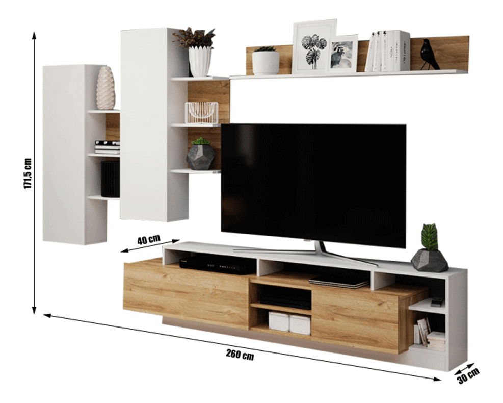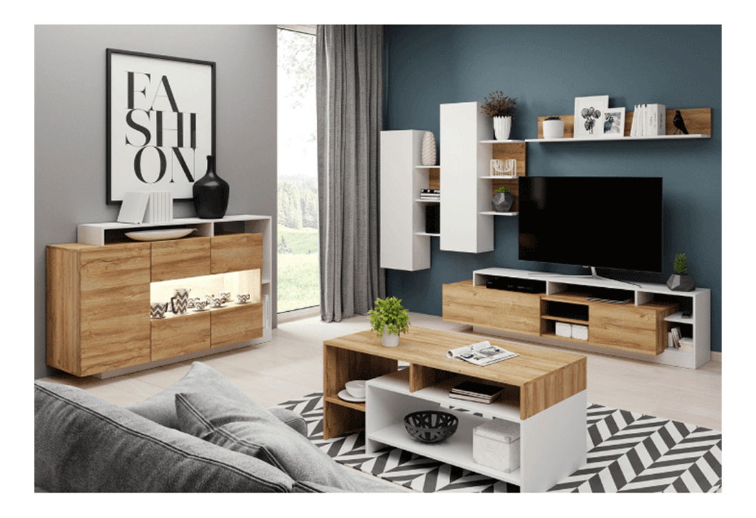 Obývací stěna Alirad je moderní a praktická volba pro Váš obývací prostor. Stěna má výšku 171,5 cm a hloubku 30-44 cm a je vyrobena z kvalitního DTD laminátu, který zaručuje vysokou odolnost a dlouhou životnost. Tento materiál je navíc velmi jednoduchý na údržbu a čištění. Stěna se skládá z několika skříněk, polic a závěsných modulů, které nabízí dostatek úložného prostoru pro vaše věci. Praktické rolovací dveře ve skříňce umožňují rychlý a snadný přístup k vnitřnímu prostoru. Stěna má barevné provedení v dub grandson/bílé barvě a je dodávána bez osvětlení, což Vám umožní zvolit si vlastní osvětlení a přizpůsobit tak stěnu Vašim požadavkům a vkusu. Je to skvělá volba pro ty, kdo hledají moderní a praktický nábytek pro svůj obývací prostor. Stěna má šířku 260 cm, tloušťku materiálu 16 mm a dodává se v demontu.
