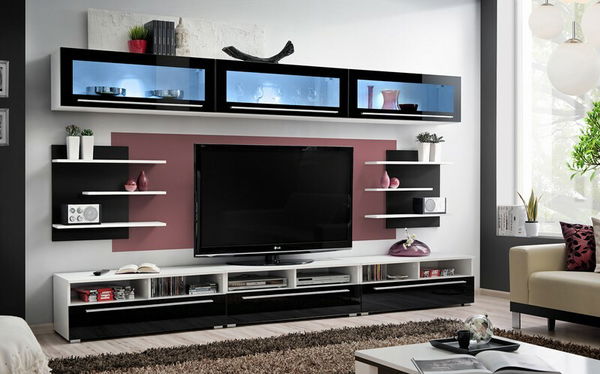 Moderní obývací stěna od výrobce ASM udělá z Vašeho obývacího pokoje stylový prostor. Korpus bílé barvy je doplněn o fronty v lesklé černé barvě. Celkový design doplňují dlouhé úhyty v chromové barvě a prosklené vitríny s modrým LED osvětlením. To navodí moderní atmosféru celého prostoru a zvýrazní předměty umístěny ve vitrínách. Tři bloky TV stolků, vitrín na stěnu, dva panely s poličkami tvoří tu dokonalou sestavu právě pro Vás.