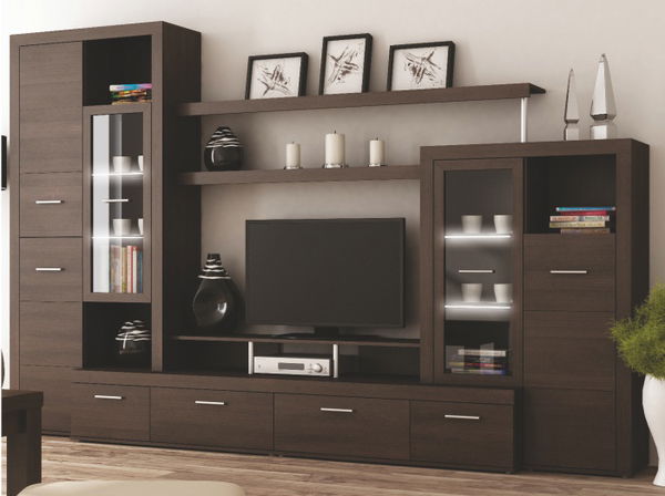 Elegance do obývacího pokoje patří a obývací stěna Atlantis s LED osvětlením v bílém tónu se Vám o eleganci postará. 2 osvětlené vitríny jsou umístěny po obou stranách obývací stěny a dodávají tmavému wenge odstínu svěží nádech. Na stěně jsou použity stejně velké šedé úchyty minimalistického rozměru. Použit odolný DTD materiál je laminován a přesvědčí o své kvalitě.