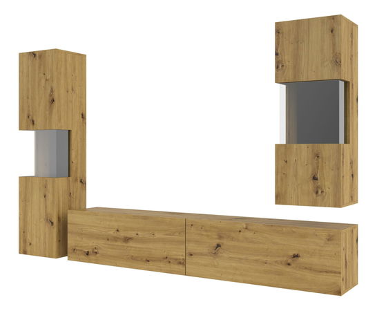 Obývací stěna Avernic Typ 10 (černá + dub artisan) je ideálním řešením pro váš obývací prostor. Tato stěna je složena ze tří částí – vitríny Avernic Typ 05, vitríny na stěnu Avernic Typ 07 a TV stolku Avernic Typ 40. Materiálem, ze kterého je stěna vyrobena, je laminovaná deska, což zaručuje pevnost a odolnost. Ve stěně naleznete dostatek úložného prostoru a plochy pro váš televizor. Kombinace černé barvy a dub artisan vypadá moderní a elegantně, a proto se stane krásným doplňkem vašeho interiéru. Stěna Avernic Typ 10 vám přináší kvalitu a design za rozumnou cenu.