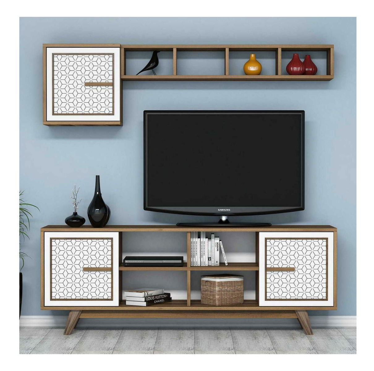 tloušťka: 18 mm, velikost TV jednotky: šířka: 160 cm, výška: 56,2 cm, hloubka: 35 cm, velikost nástěnné police: šířka: 117,6 cm, výška: 18,6 cm, hloubka: 20 cm, velikost skříňky: šířka: 42,4 cm, výška: 42,4 cm, hloubka: 25 cm