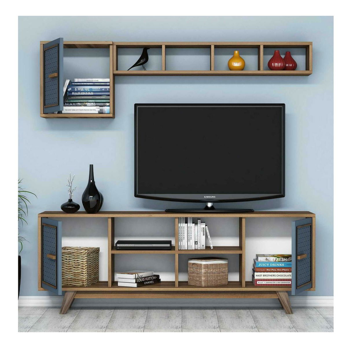 Obývací stěna Aysha (ořechová + modrá)