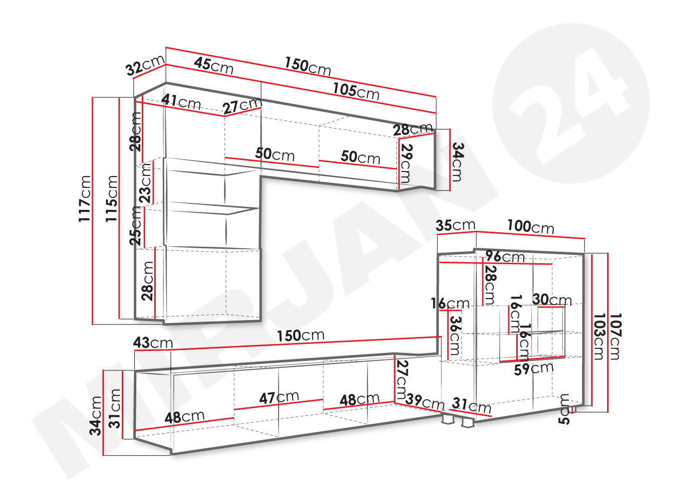 Obývací stěna je ideální volbou pro ty, kteří hledají pohodlí a styl. Uvedená cena zahrnuje následující komponenty: TV skříňka Bralani 150 BR04: šířka: 150, výška: 37, hloubka: 43 x 1ks Police Bralani BR02: šířka: 105, výška: 35, hloubka: 32 x 1ks Závěsná vitrína7, hloubka: 32 x 1ks Komoda Bralani BR01: šířka: 100, výška: 107, hloubka: 35 x 1ks Barvy: možnost výběru barev zde Vyrobeno: korpus – laminovaná dřevotřísková - 16mm, dvířka – laminovaná dřevotřísková - 15mm stříbrné - 5cm) nebo je možné ji zavěsit na zeď, hrany PVC, kalené sklo, bez úchytek, s možností dokoupení LED osvětlení studené bílé nebo modré, součástí sestavy jsou plíšky k montáži na zeď, ale součástí nejsou montážní hmoždinky Záruční doba: 24 měsíců