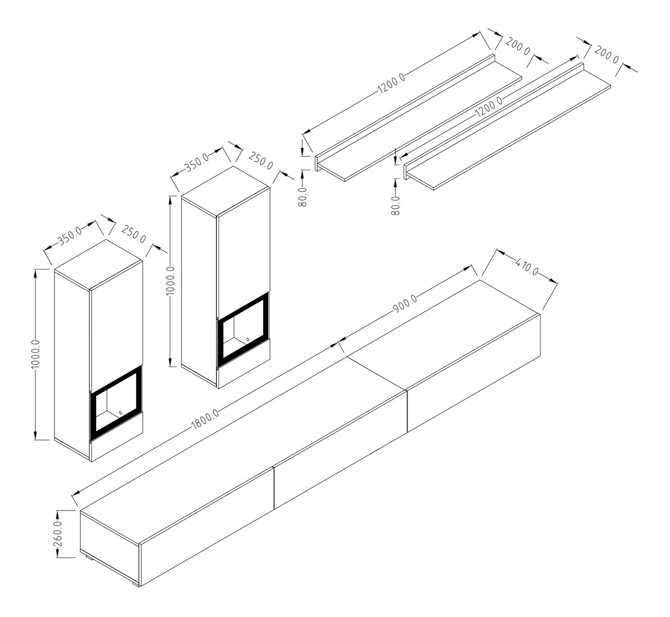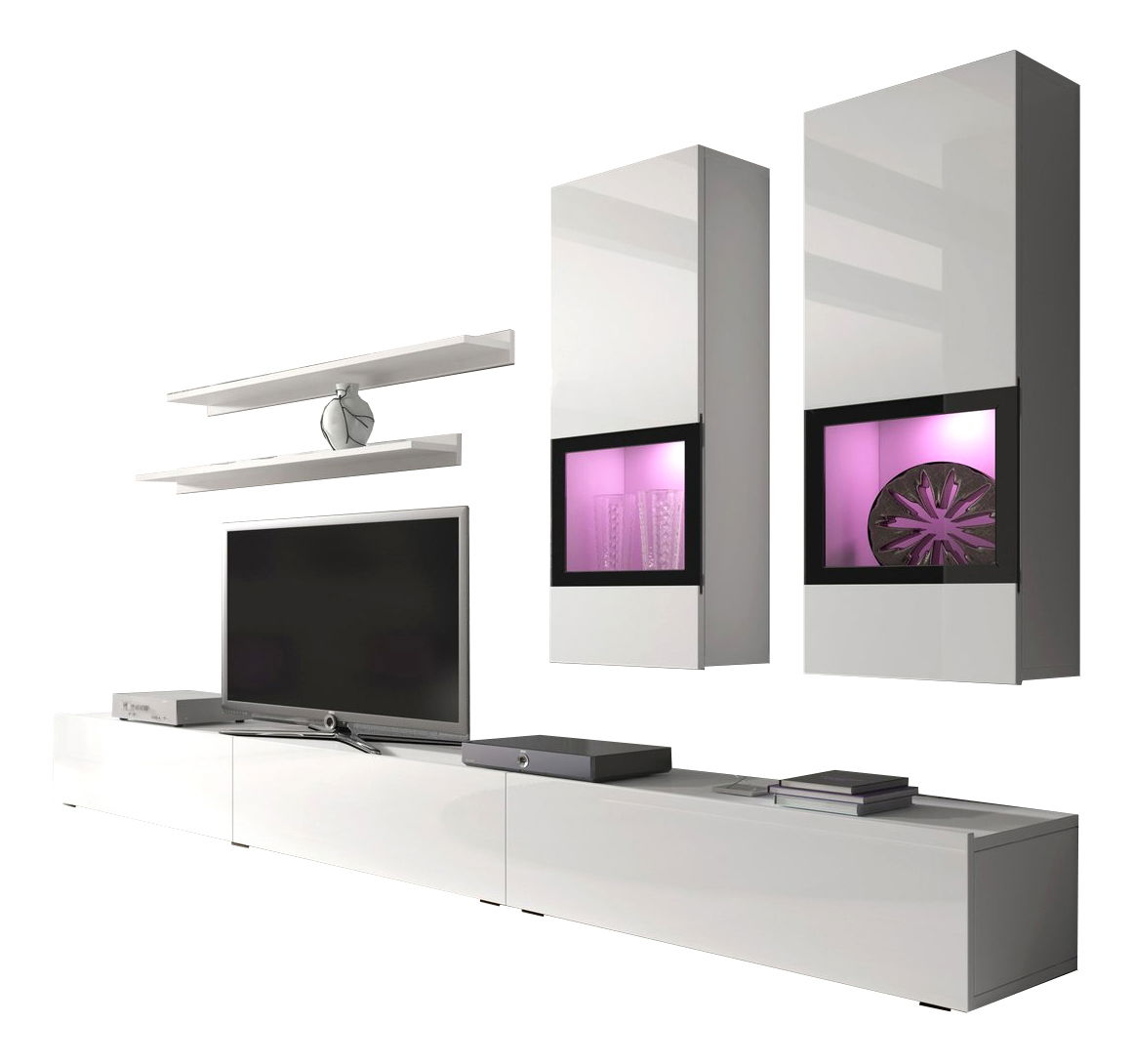 ZobrazitObývací stěna sestává ze dvou skříněk na zavěšení, dvou poliček a skříňky / TV stolku. Jednotlivé prvky si můžete umístit dle vašeho vkusu a priestorvých možností, nebo se inspirovat uspořádáním na fotce. K obývací stěně se dá dokoupit i osvětlení vitrín.