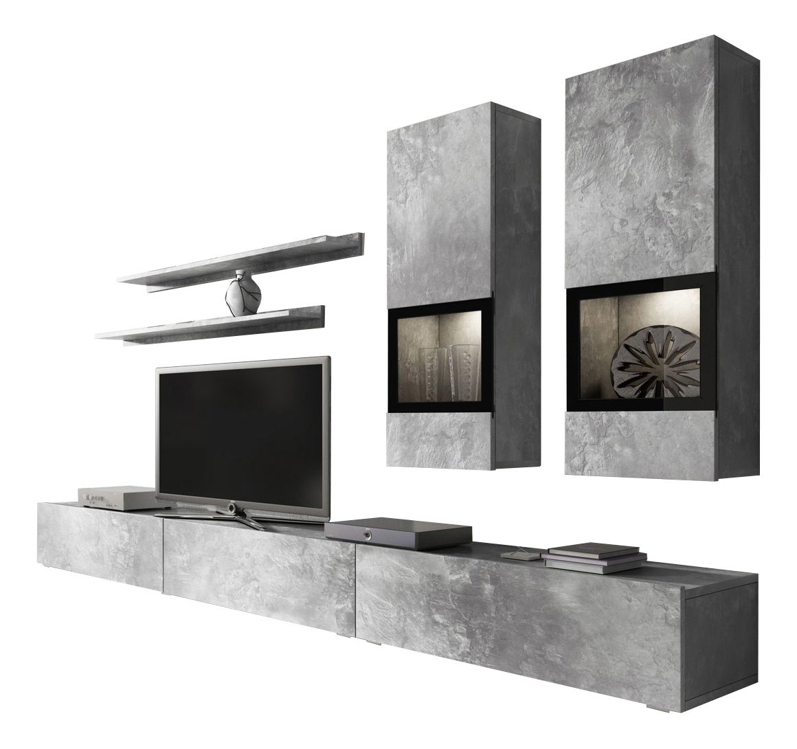 Obývací stěna sestává ze dvou skříněk na zavěšení, dvou poliček a skříňky/TV stolku. Jednotlivé prvky si můžete umístit dle vašeho vkusu a priestorvých možností, nebo se inspirovat uspořádáním na fotce. K obývací stěně se dá dokoupit i osvětlení vitrín.