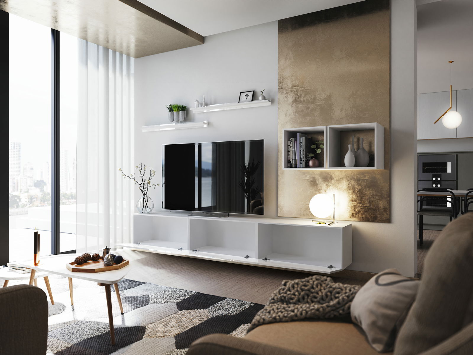 Obývací stěna Berny je kombinací nejdůležitějších prvků v obývacím pokoji. Kromě funkčnosti obývací stěny je třeba věnovat pozornost i jejího vzhledu. Všechna dvířka se otevírají důmyslným PUSH-CLICK systémem, kdy stačí jemně zatlačit pro otevření nebo opětovné zavření dvířek. K této obývací stěně je možnost zakoupení LED osvětlení. Nábytek má dvě možnosti montáže: můžete ji umístit na stěnu, opticky zvětšit prostor, přidat její lehkost nebo ji umístit na podlahu pomocí nožiček.