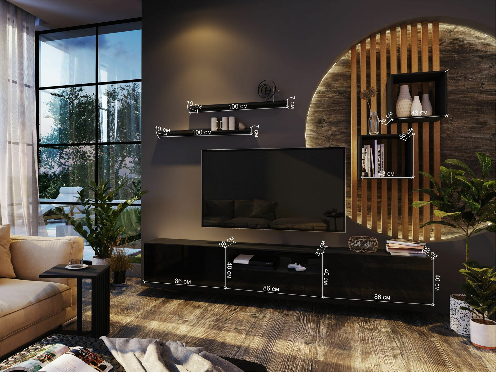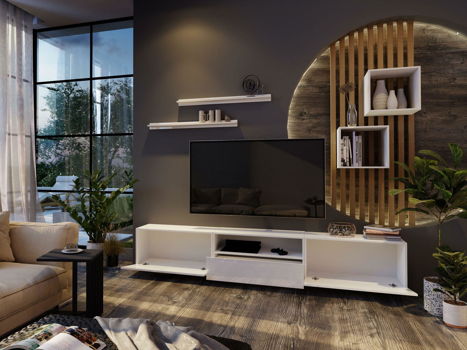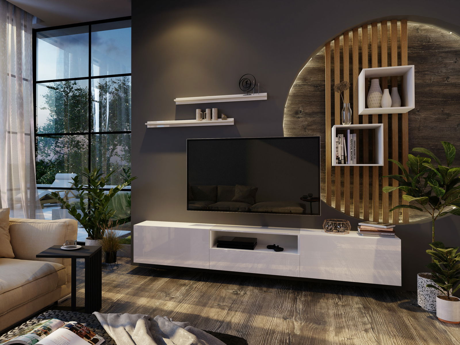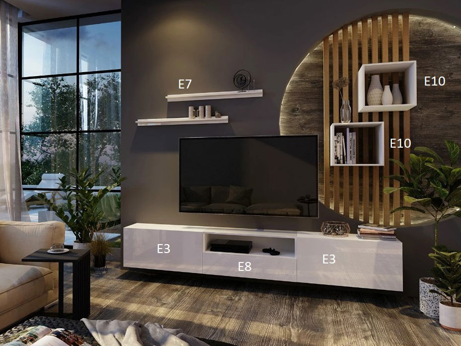Bílá obývací stěna Berny je skvělou volbou do každého obývacího pokoje. Tato stěna kombinuje funkčnost a moderní vzhled do dokonalého celku. Všechna dvířka mají důmyslný PUSH-CLICK systém, který umožňuje snadné otevření a zavření. Tato sestava má také možnost zakoupení LED osvětlení, které dodá pokoji ještě více stylu. Obývací stěna Berny se může umístit na stěnu, čímž opticky zvětší prostor a přidá lehkost místnosti nebo na podlahu s pomocí nožiček. Materiál sestavy je MDF lakovaná pro přední části a dřevotříska o tloušťce 16 mm pro korpus. Způsob otevírání dvířek je PUSH TO OPEN.