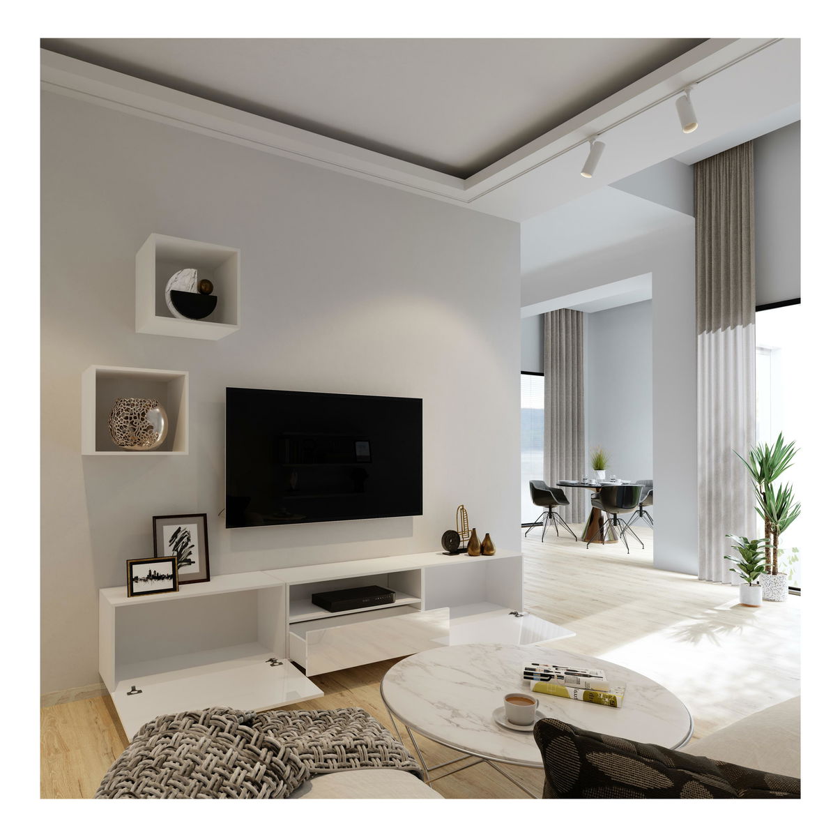 Bílá obývací stěna Berny je skvělou volbou do každého obývacího pokoje. Tato stěna kombinuje funkčnost a moderní vzhled do dokonalého celku. Všechna dvířka mají důmyslný PUSH-CLICK systém, který umožňuje snadné otevření a zavření. Tato sestava má také možnost zakoupení LED osvětlení, které dodá pokoji ještě více stylu. Obývací stěna Berny se může umístit na stěnu, čímž opticky zvětší prostor a přidá lehkost místnosti nebo na podlahu s pomocí nožiček. Materiál sestavy je MDF lakovaná pro přední části a dřevotříska o tloušťce 16 mm pro korpus. Způsob otevírání dvířek je PUSH TO OPEN.