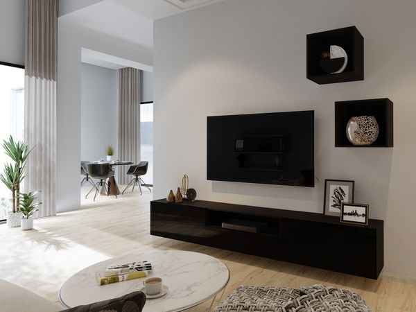Obývací stěna Berny v černém lesku je ideální kombinací funkčnosti a designu pro váš obývací pokoj. Dveře jsou vybaveny důmyslným PUSH-CLICK systémem, který zajišťuje pohodlné otevírání a zavírání. Součástí stěny je také možnost zakoupení LED osvětlení, které ještě více zvýrazní její eleganci. Stěnu můžete namontovat na stěnu, čímž opticky zvětšíte prostor, nebo ji umístit na podlahu pomocí nožiček. Stěnu tvoří skříňky, závěsná police a vitríny, které jsou vyrobeny z kvalitního materiálu. Fronty jsou z MDF lakované desky a korpus je z dřevotřísky o tloušťce 16 mm. Rozměry jednotlivých komponent stěny jsou uvedeny níže.
