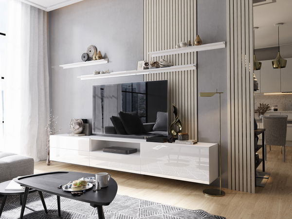 ZobrazitBílá obývací stěna Berny je skvělou volbou do každého obývacího pokoje. Tato stěna kombinuje funkčnost a moderní vzhled do dokonalého celku. Všechna dvířka mají důmyslný PUSH-CLICK systém, který umožňuje snadné otevření a zavření. Tato sestava má také možnost zakoupení LED osvětlení, které dodá pokoji ještě více stylu. Obývací stěna Berny se může umístit na stěnu, čímž opticky zvětší prostor a přidá lehkost místnosti nebo na podlahu s pomocí nožiček. Materiál sestavy je MDF lakovaná pro přední části a dřevotříska o tloušťce 16 mm pro korpus. Způsob otevírání dvířek je PUSH TO OPEN.