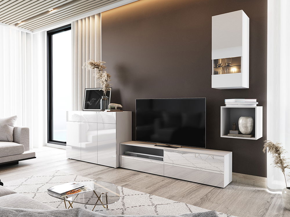 ZobrazitBílá obývací stěna Berny je skvělou volbou do každého obývacího pokoje. Tato stěna kombinuje funkčnost a moderní vzhled do dokonalého celku. Všechna dvířka mají důmyslný PUSH-CLICK systém, který umožňuje snadné otevření a zavření. Tato sestava má také možnost zakoupení LED osvětlení, které dodá pokoji ještě více stylu. Obývací stěna Berny se může umístit na stěnu, čímž opticky zvětší prostor a přidá lehkost místnosti nebo na podlahu s pomocí nožiček. Materiál sestavy je MDF lakovaná pro přední části a dřevotříska o tloušťce 16 mm pro korpus. Způsob otevírání dvířek je PUSH TO OPEN.