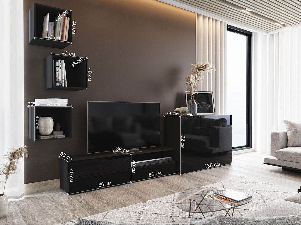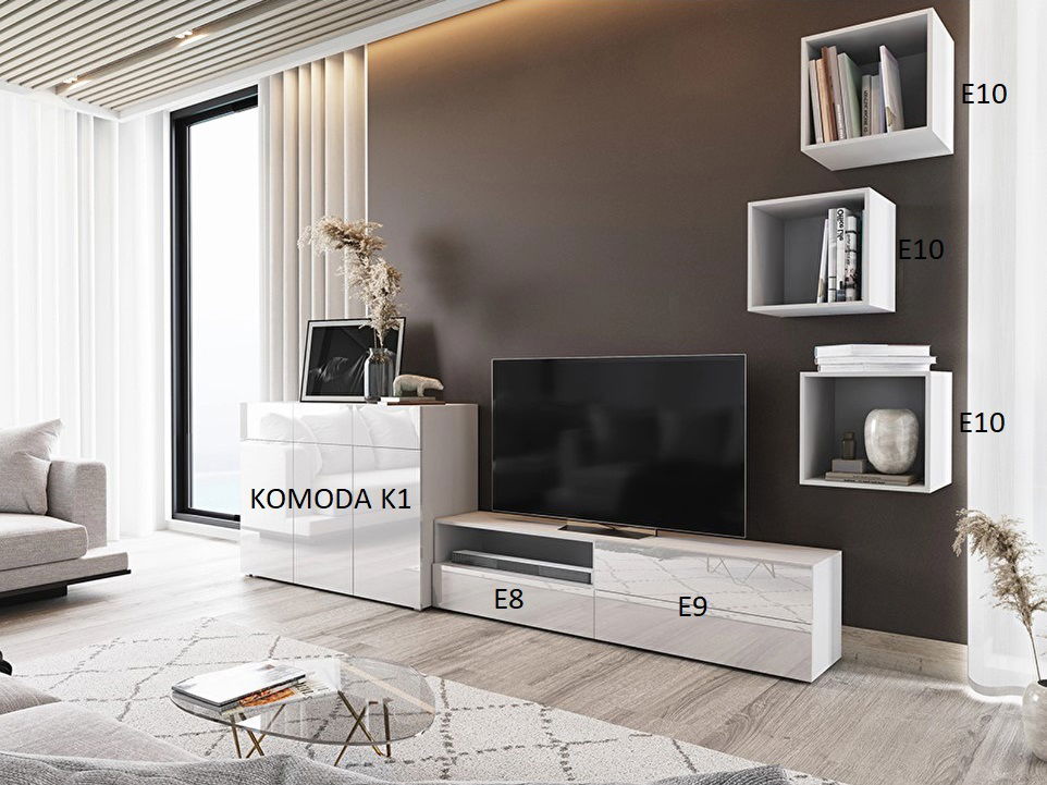 ZobrazitBílá obývací stěna Berny je skvělou volbou do každého obývacího pokoje. Tato stěna kombinuje funkčnost a moderní vzhled do dokonalého celku. Všechna dvířka mají důmyslný PUSH-CLICK systém, který umožňuje snadné otevření a zavření. Tato sestava má také možnost zakoupení LED osvětlení, které dodá pokoji ještě více stylu. Obývací stěna Berny se může umístit na stěnu, čímž opticky zvětší prostor a přidá lehkost místnosti nebo na podlahu s pomocí nožiček. Materiál sestavy je MDF lakovaná pro přední části a dřevotříska o tloušťce 16 mm pro korpus. Způsob otevírání dvířek je PUSH TO OPEN.