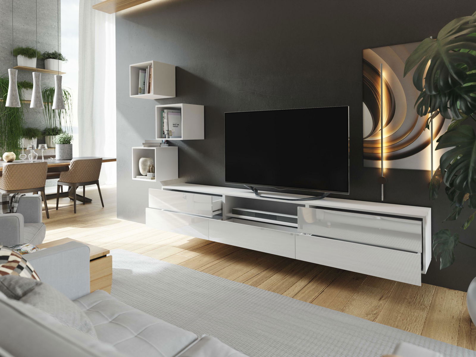 ZobrazitBílá obývací stěna Berny je skvělou volbou do každého obývacího pokoje. Tato stěna kombinuje funkčnost a moderní vzhled do dokonalého celku. Všechna dvířka mají důmyslný PUSH-CLICK systém, který umožňuje snadné otevření a zavření. Tato sestava má také možnost zakoupení LED osvětlení, které dodá pokoji ještě více stylu. Obývací stěna Berny se může umístit na stěnu, čímž opticky zvětší prostor a přidá lehkost místnosti nebo na podlahu s pomocí nožiček. Materiál sestavy je MDF lakovaná pro přední části a dřevotříska o tloušťce 16 mm pro korpus. Způsob otevírání dvířek je PUSH TO OPEN.
