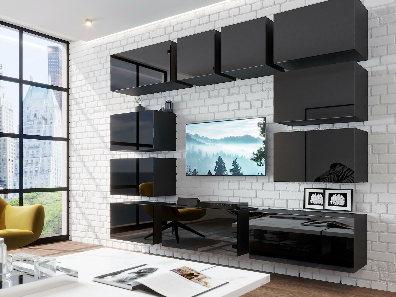 Obývací stěna Berny v černém lesku je ideální kombinací funkčnosti a designu pro váš obývací pokoj. Dveře jsou vybaveny důmyslným PUSH-CLICK systémem, který zajišťuje pohodlné otevírání a zavírání. Součástí stěny je také možnost zakoupení LED osvětlení, které ještě více zvýrazní její eleganci. Stěnu můžete namontovat na stěnu, čímž opticky zvětšíte prostor, nebo ji umístit na podlahu pomocí nožiček. Stěnu tvoří skříňky, závěsná police a vitríny, které jsou vyrobeny z kvalitního materiálu. Fronty jsou z MDF lakované desky a korpus je z dřevotřísky o tloušťce 16 mm. Rozměry jednotlivých komponent stěny jsou uvedeny níže.