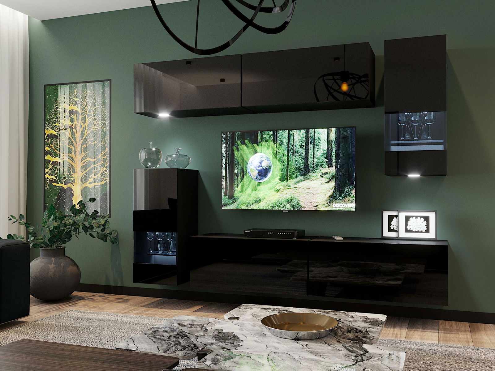 Obývací stěna Berny v černém lesku je ideální kombinací funkčnosti a designu pro váš obývací pokoj. Dveře jsou vybaveny důmyslným PUSH-CLICK systémem, který zajišťuje pohodlné otevírání a zavírání. Součástí stěny je také možnost zakoupení LED osvětlení, které ještě více zvýrazní její eleganci. Stěnu můžete namontovat na stěnu, čímž opticky zvětšíte prostor, nebo ji umístit na podlahu pomocí nožiček. Stěnu tvoří skříňky, závěsná police a vitríny, které jsou vyrobeny z kvalitního materiálu. Fronty jsou z MDF lakované desky a korpus je z dřevotřísky o tloušťce 16 mm. Rozměry jednotlivých komponent stěny jsou uvedeny níže.