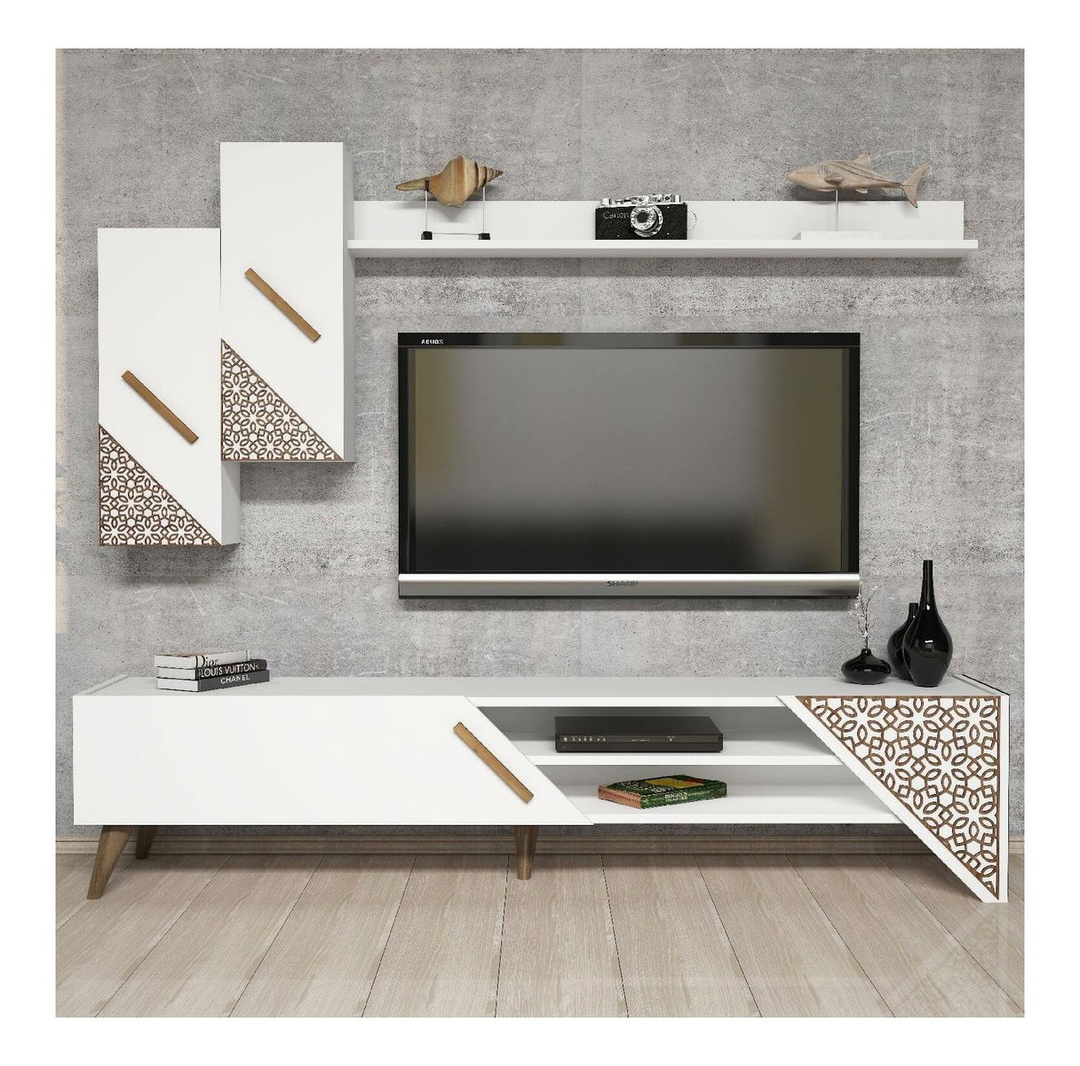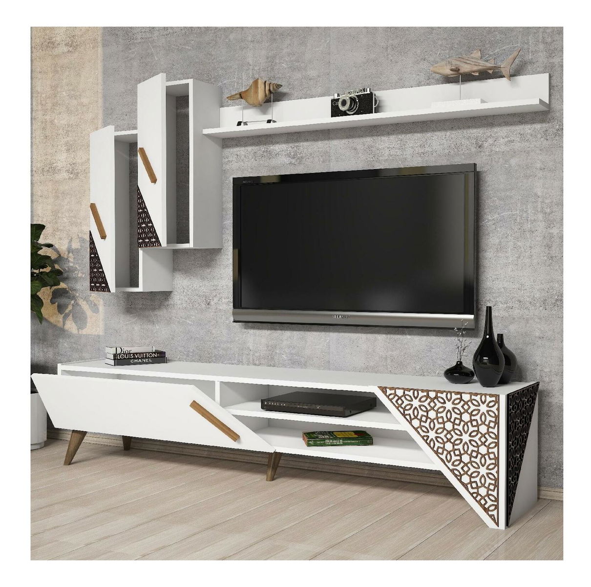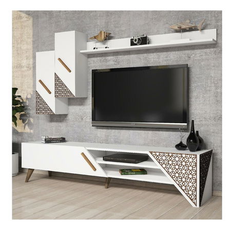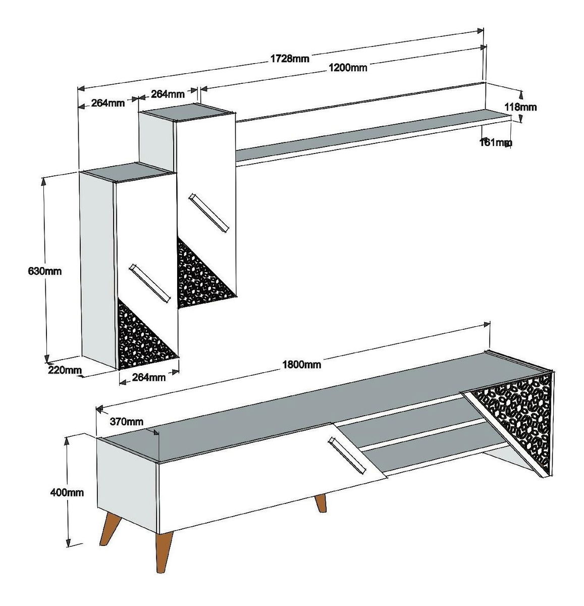 tloušťka: 18 mm, 4 mm, cnc reliéfní plastové nohy, velikost TV jednotky: šířka: 180 cm, výška: 40 cm, hloubka: 37 cm, velikost nástěnné police: šířka: 120 cm, výška: 11,8 cm, hloubka: 16,1 cm, velikost skříňky: šířka: 26,4 cm, výška: 63 cm, hloubka: 22 cm