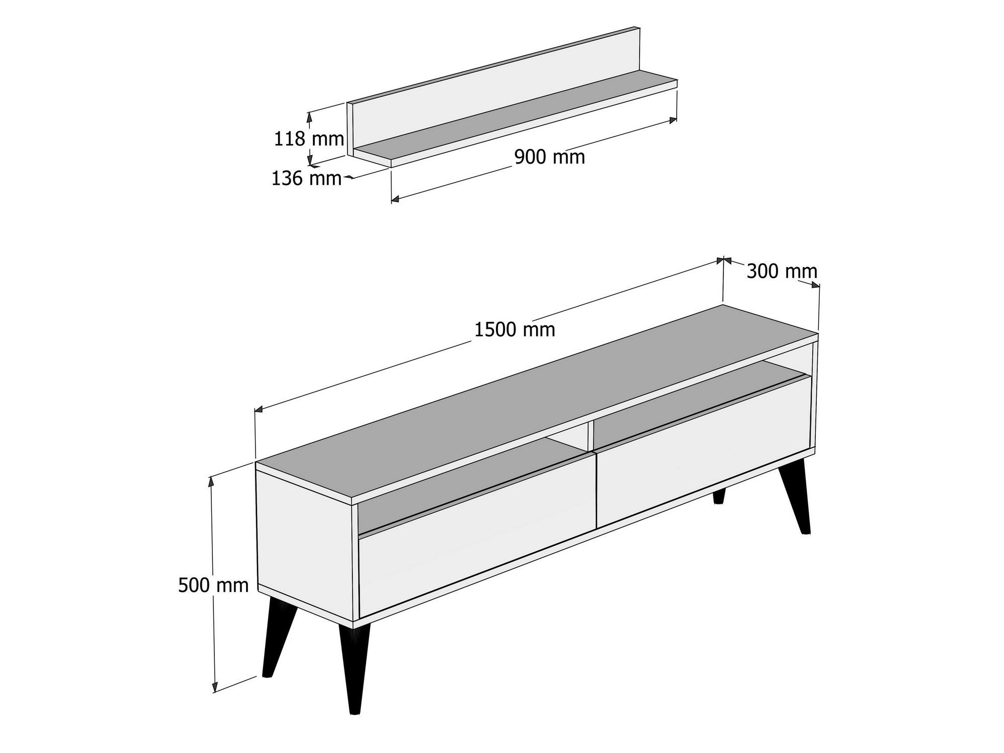 tloušťka: 18 mm, velikost TV stojanu: šířka: 150 cm, výška: 50 cm, hloubka: 30 cm, velikost nástěnné police: šířka: 90 cm, výška: 11,8 cm, hloubka: 13,6 cm