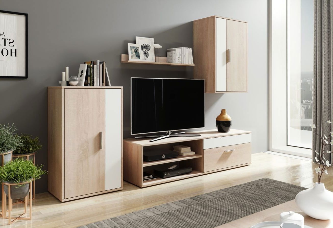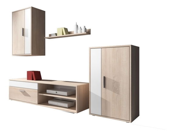 ZobrazitObývací stěna Beth (dub sonoma + bílá) je moderní nábytek, který vám poskytne dostatek úložného prostoru pro vaše věci. Součástí jsou polička, TV stolek, závěsná a klasická komoda. Stěna je vyrobena z kvalitní dřevotřísky, laminátu a MDF zadní strany o tloušťce 16 mm a ABS hrany o tloušťce 0,5 mm. Polička má rozměry 78,6x17,1x8 cm, nástěnná komoda 50x28x77,2 cm, TV stolek 140x35x36,2 cm a komoda 50x29,5x84,2 cm. Dvířka jsou vybavena typem pantů Gtv fi35 a nožičky jsou plastové v barvě černé. Stěna obsahuje 5 nožiček pro TV stolek a 4 nožičky pro komodu, každá nožička má výšku 2,5 cm. Rukojeť je vyrobena z plastu v barvě šedé a její rozměry jsou (š.hl.v.): 14,8x1,8x1,03 mm.
