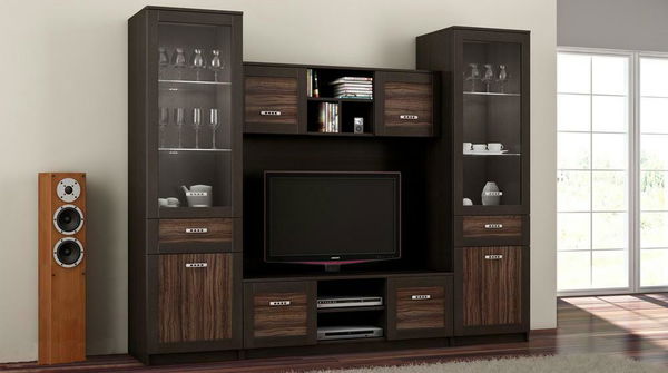 Obývací stěna Boss 1 se skládá s dvou vitrínách BS 08, TV stolku BS 01 a Poličky BS 02.